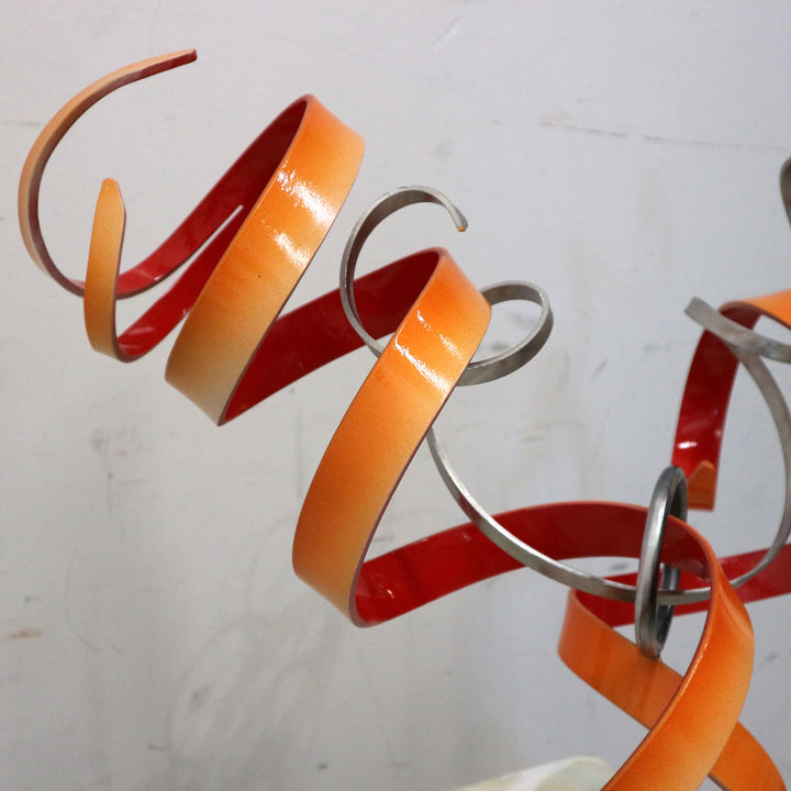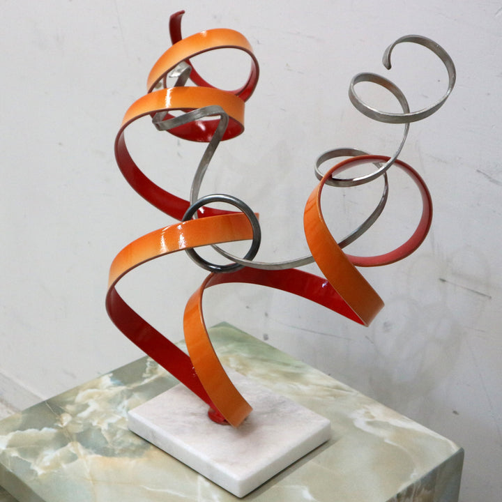 Abstract Steel Red & Orange w/Ring Sculpture on White Marble Base