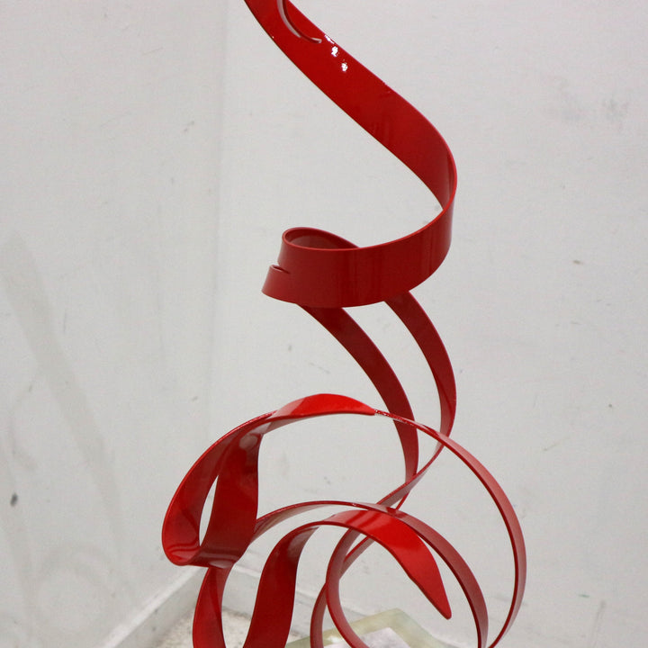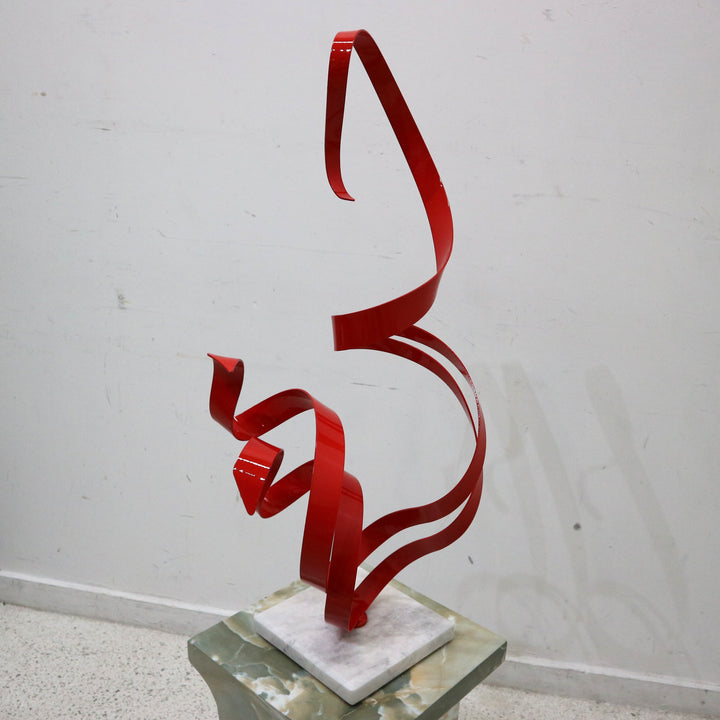 Abstract Steel Red Wave Sculpture on White Marble Base