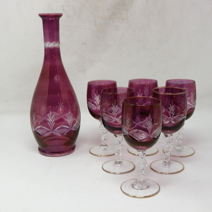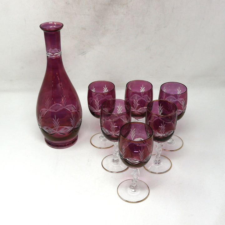 Cranberry Crystal Etched Decanter & 6 Glasses
