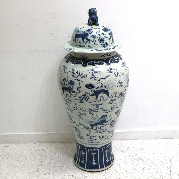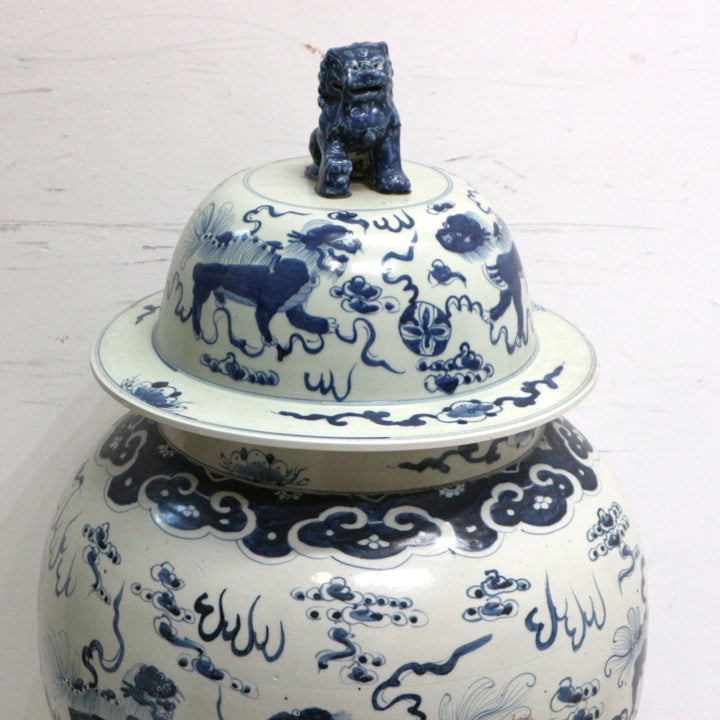 Pair of Porcelain Blue & White Foo Dog Ginger Jars