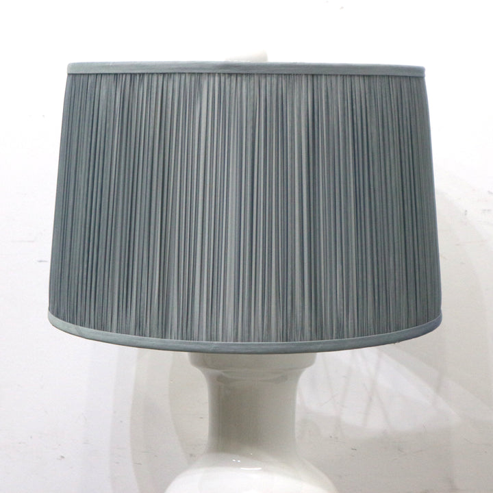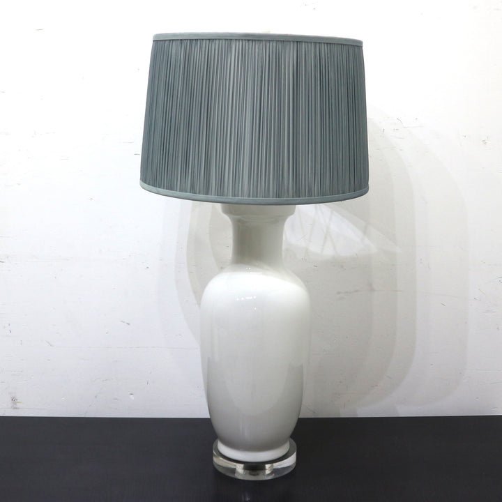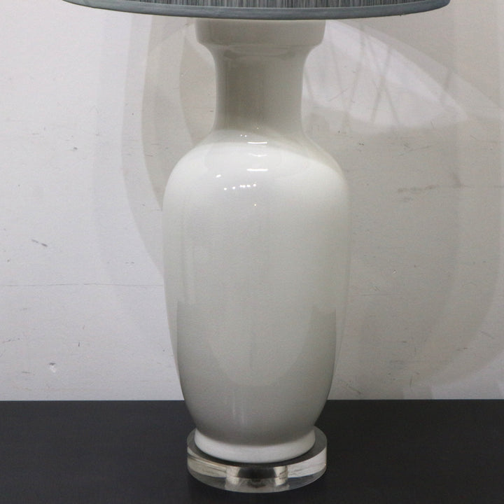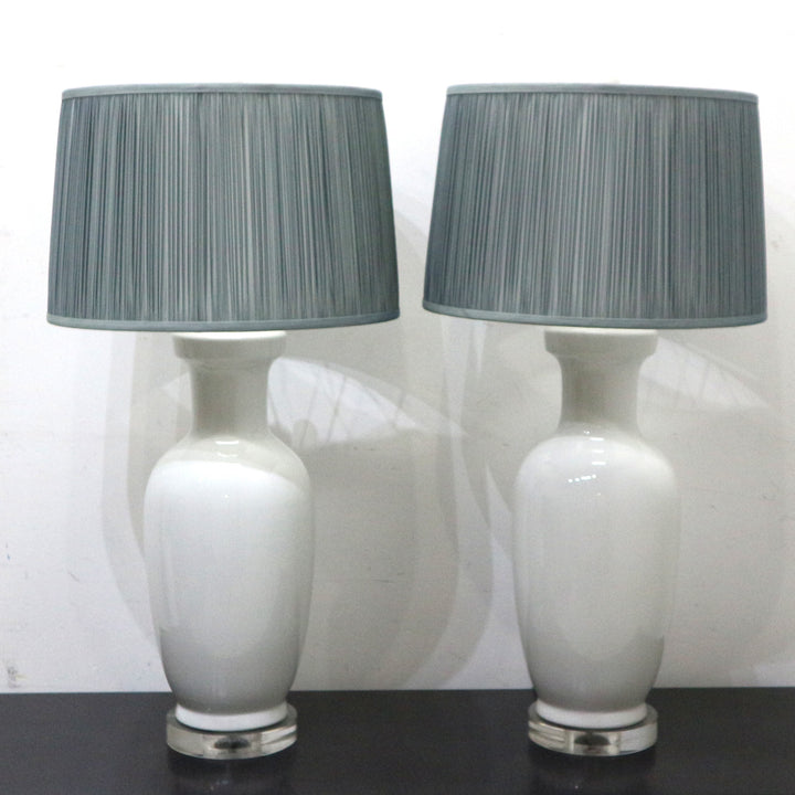 Pair of White Ceramic Lamps on Acrylic Base w/ Blue Gray Shades