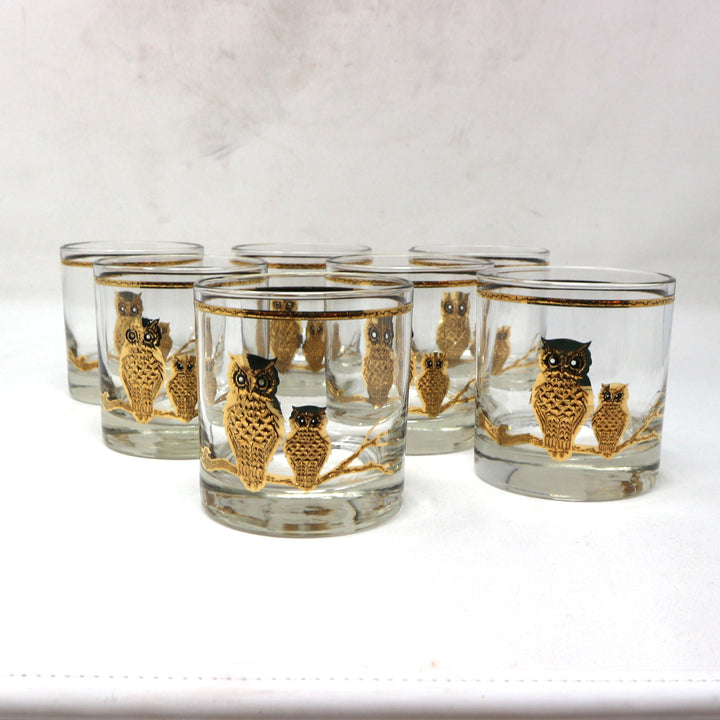 Set of 7 MCM Culver 22K Owl Lowball Glasses