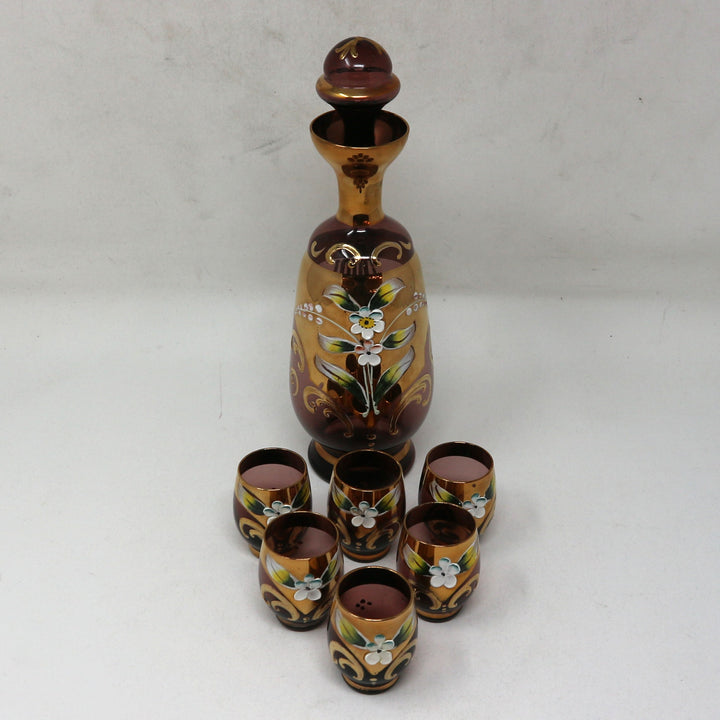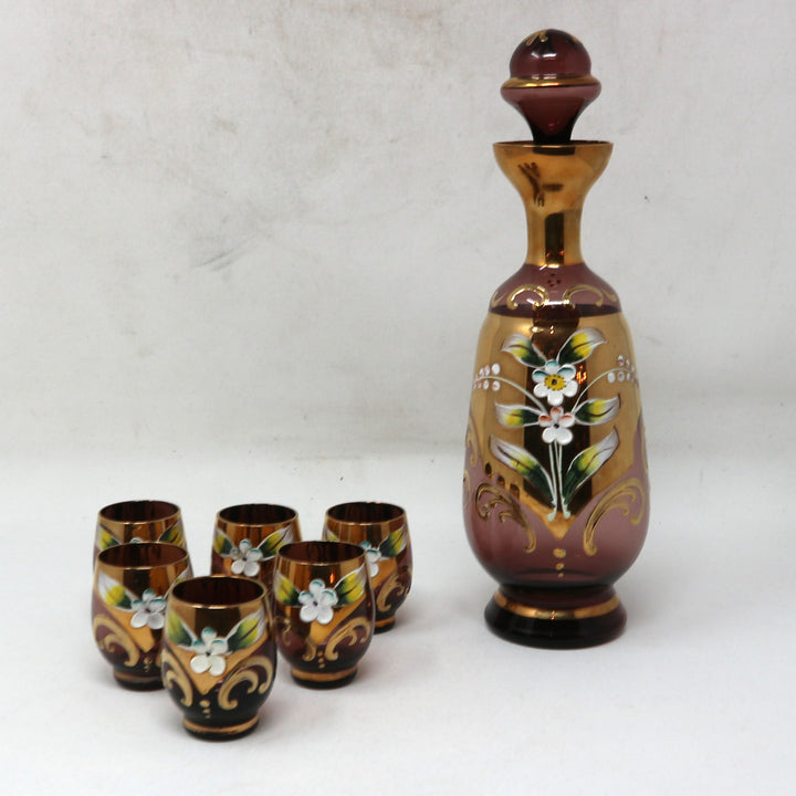 Vintage Gold & Enamel Glass Decanter & Glasses